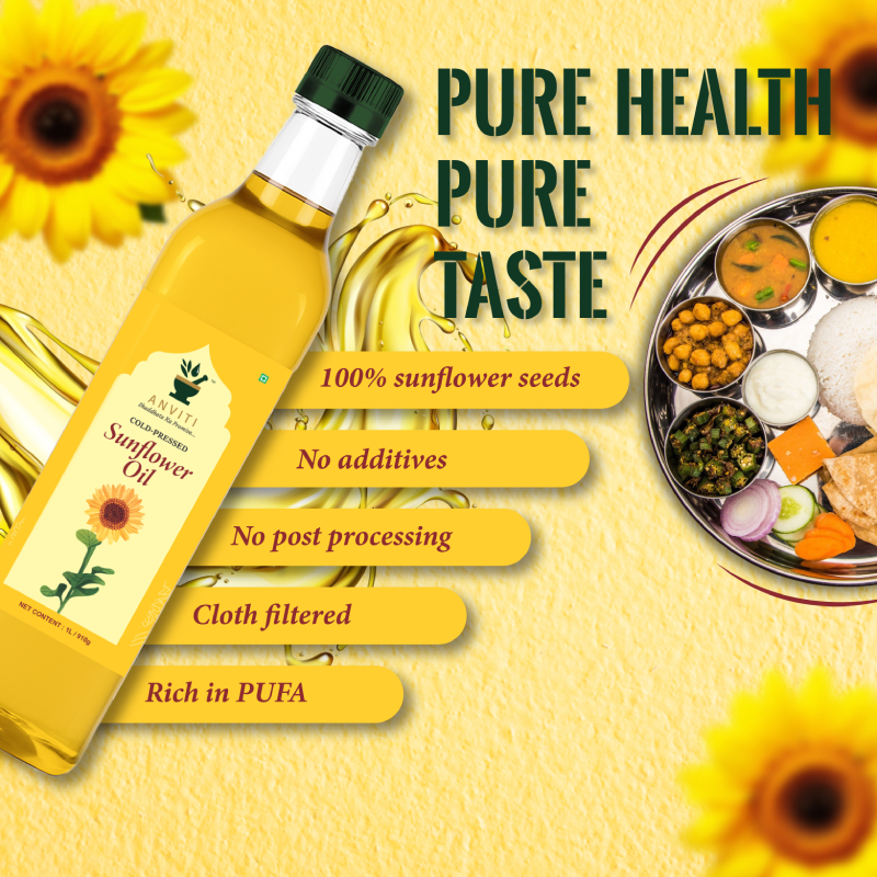 Bring home the lightness and goodness of pure sunflower seeds with Anviti 100% Pure and Unrefined Cold Pressed Sunflower Oil to preserve nutrients and natural flavour.